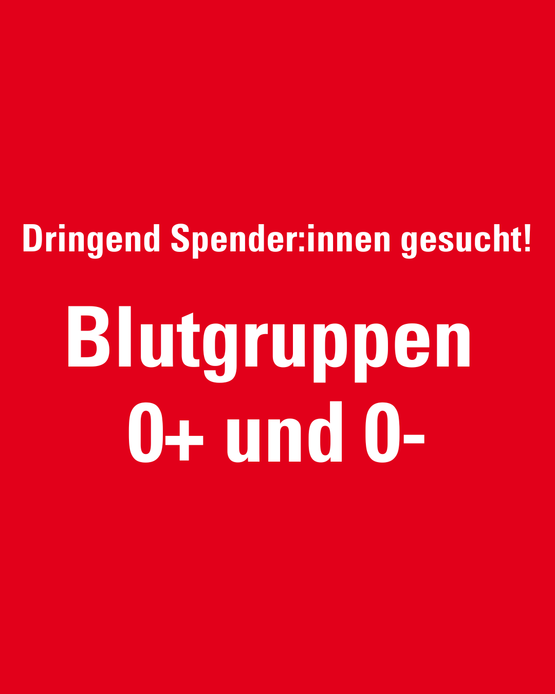 Wir benötigen dringend Spender:innen der Blutgruppe 0 positiv und 0 negativ! Deine Spende kann Leben retten, komm vorbei und hilf mit.